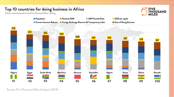 According to the Five Thousand Miles, a Portuguese company that specializes in international business development, particularly in Africa data and ranking were arrived at after considering and comparing economic indices. such as Population, Nominal GDP, Foreign Reserves, GDP Growth Rate, Transparency Index, Ease of doing Business, GDP Per Capital And Current Account Balance.
